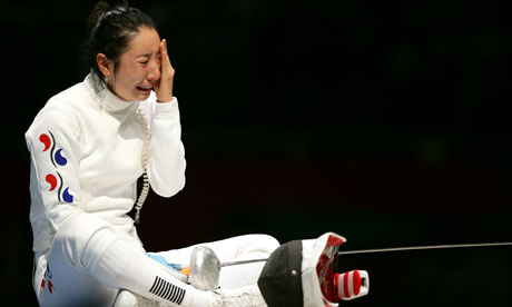 Women’s Epeeist, Shin Lam of Korea, after her controversial defeat in the 2012 Olympics. Photo from TheGaurdian.com